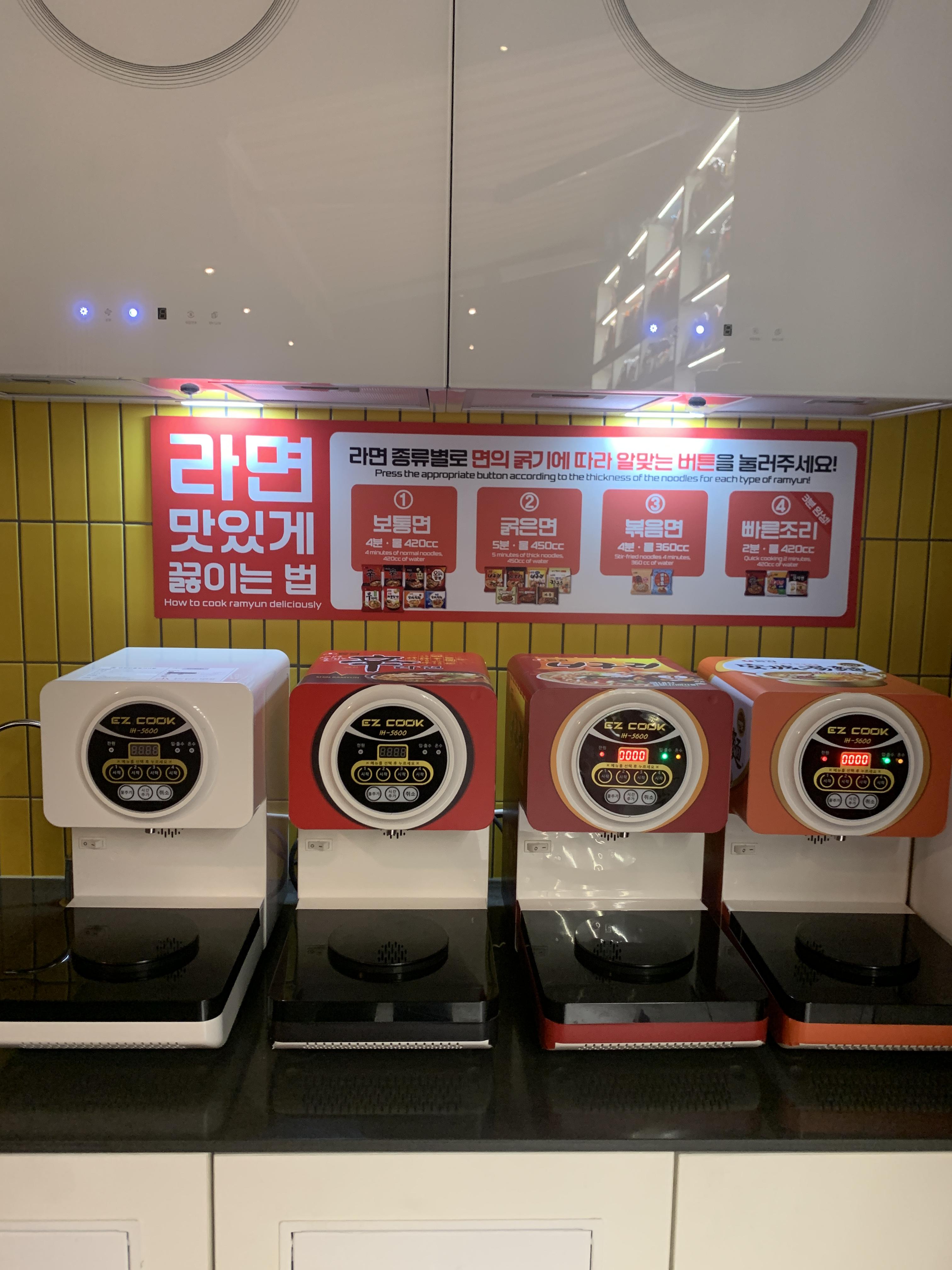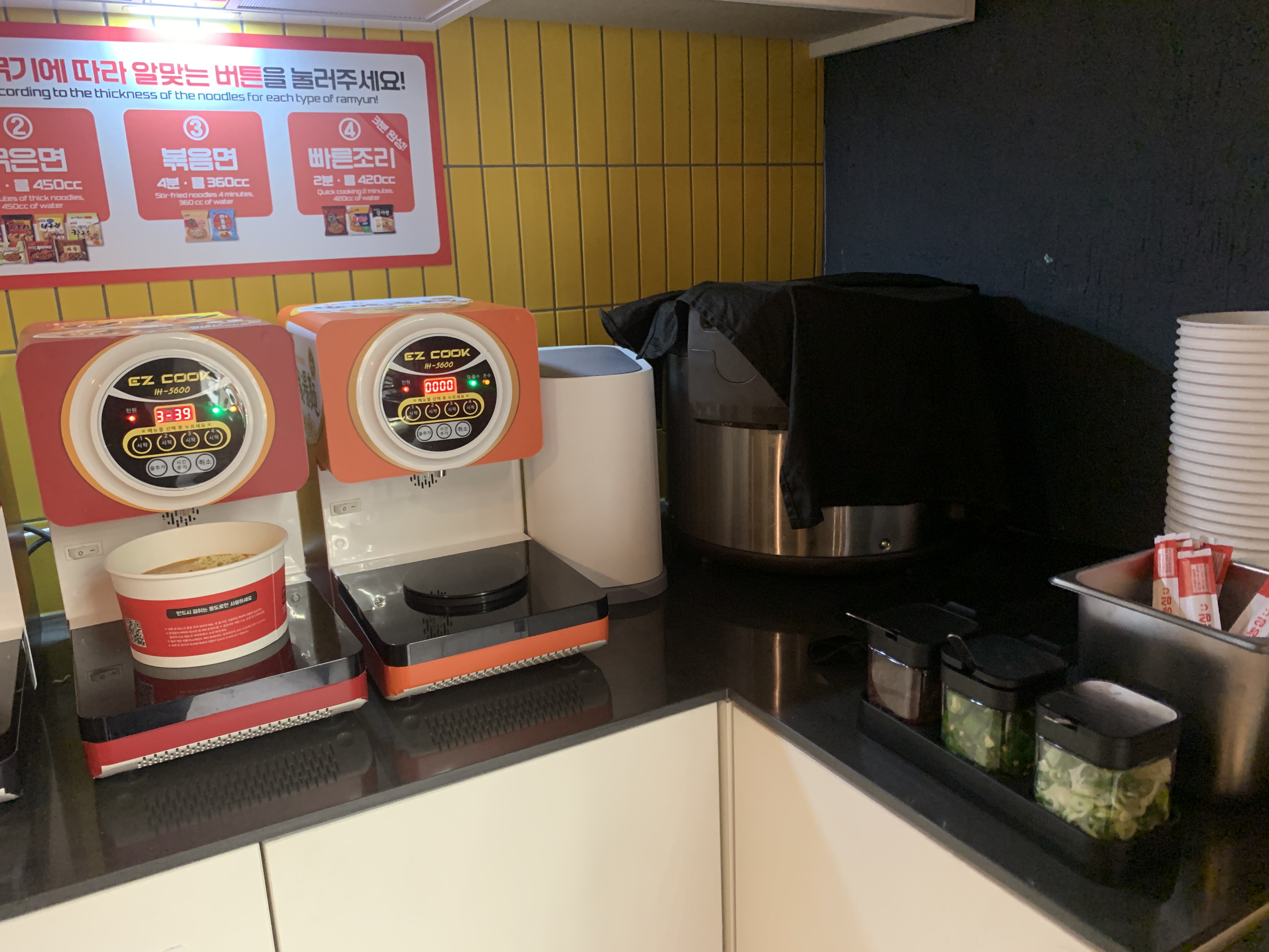 그 옆으로는 한강라면 기계가 있어서 바로 끓여서 먹을 수 있도록 셋팅 되어 있었다.