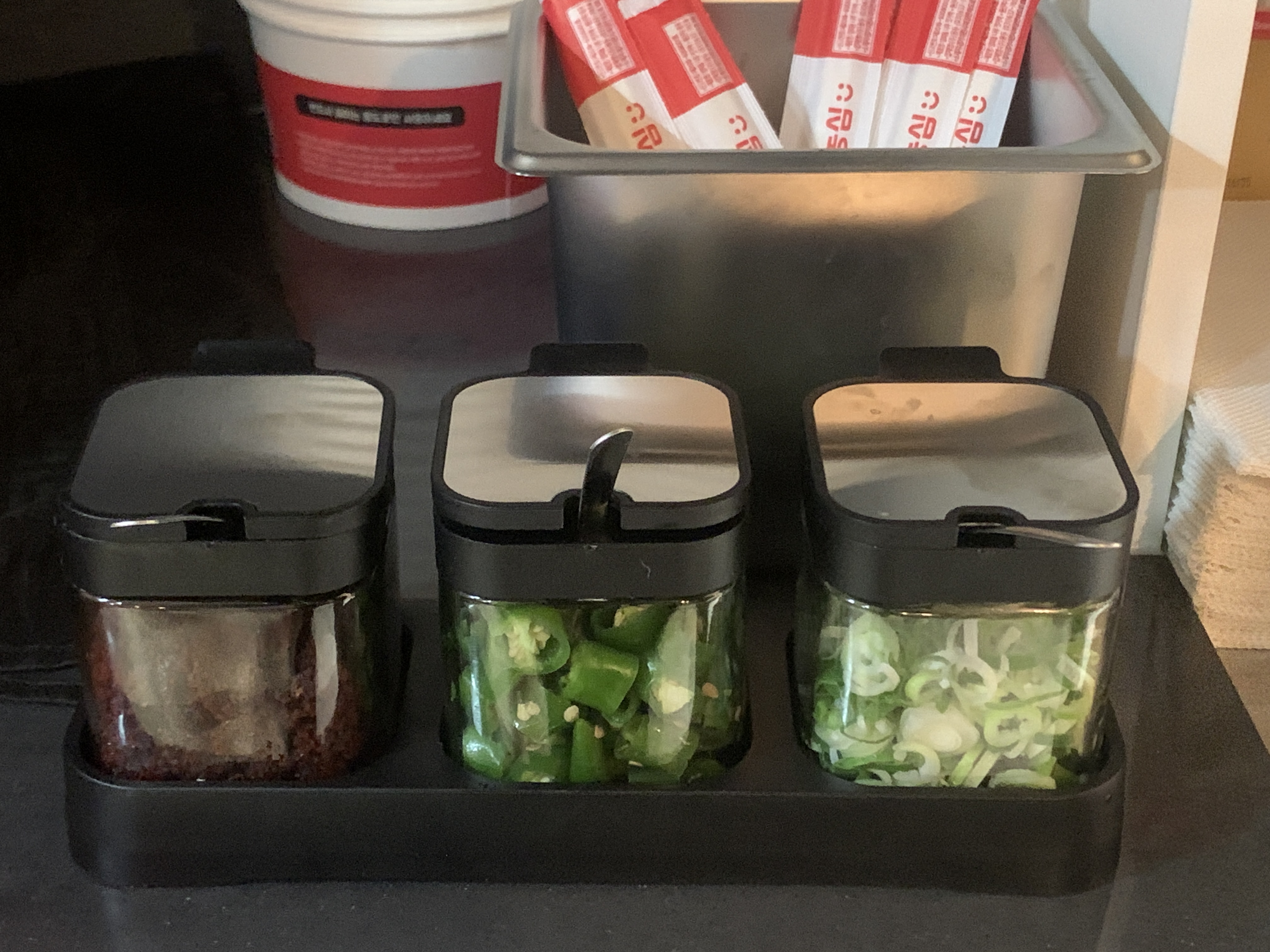 한강라면 끓이는 곳 옆에는 다대기, 고추, 파도 있어서 취향껏 넣어 먹으면 된다고 한다.