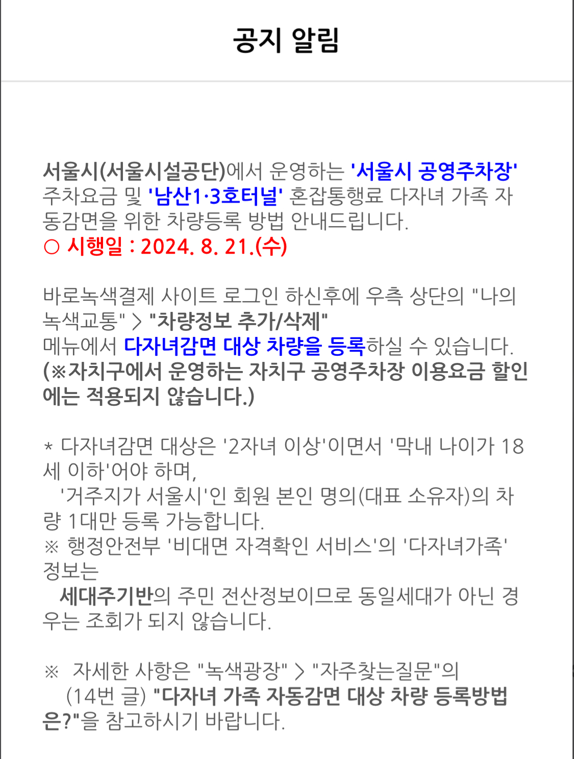 - 다자녀감면 대상 차량 등록 후에 이용 가능하다는 것