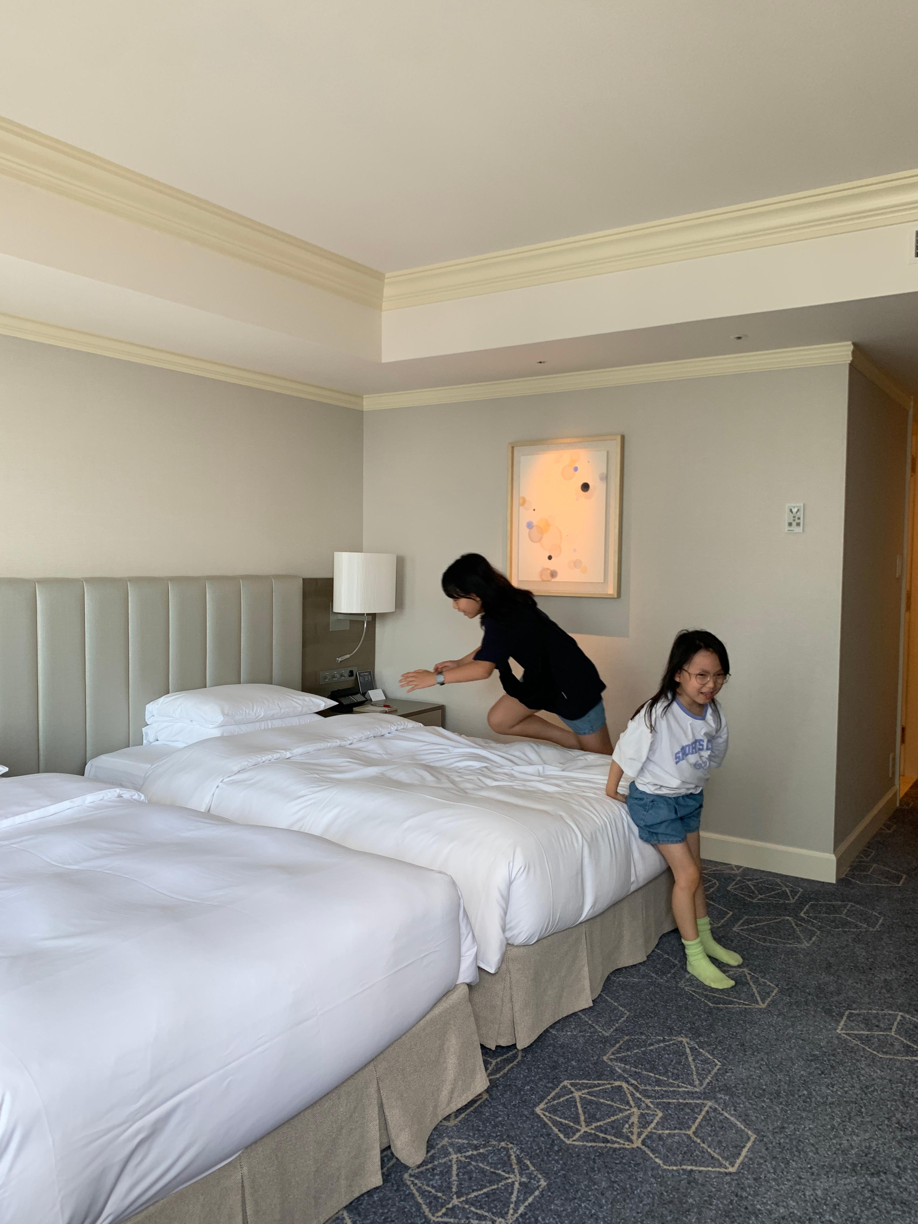 일단 메리어트 계열 호텔은 기본 침대가 더블베드 입니다. 그렇기 때문에 헐리우드베드로 붙이면 편하게 4명이 잘 수 있는 구조였고 더블베드라 성인1명과 아이1명 자기에도 편합니다. 3박 내내 편안한게 투숙 했어요.